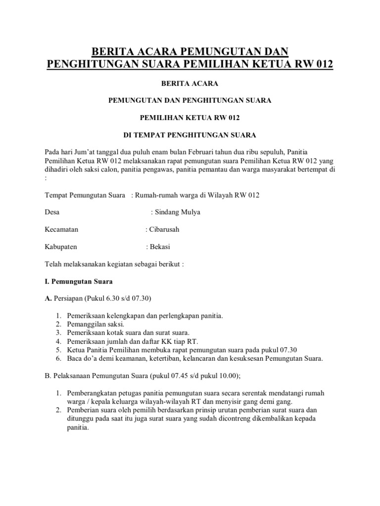 Untuk pengaturan di provinsi dki jakarta, masa bakti pengurus rt selama 3 (tiga) tahun terhitung sejak tanggal dibuatnya berita acara pemilihan ketua rt dan/atau saat penandatanganan berita acara penyerahan tugas dan tanggung jawab dari panitia pemilihan kepada ketua rt terpilih, kemudian ditetapkan dengan keputusan lurah. Contoh surat berita acara penghitungan suara pemungutan suara dan perhitungan suara. Perjalanan dinas dalam melakukan pengiriman barang, maka diwajibkan bagi pihak pengirim untuk membuat surat jalan agar barang yang dikirim lebih jelas secara detail. Berita acara pemilihan ketua rt. 06 perum keroncong village rt 06 07 kecamatan jatiuwung kodya tangerang pada hari ini minggu tanggal dua puluh tiga bulan november tahun dua ribu empat belas jam 08 00 s d 15 00 wib bertempat di rt 06 07 perum keroncong village desa kelurahan keroncong.